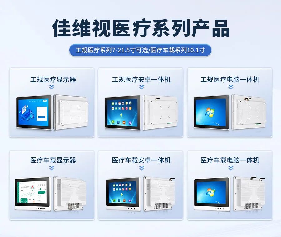 佳維視深入探索醫療應用場景,以強大的硬件基礎優勢,開發出智慧醫療專線品類,包含醫療顯示器、醫療一體機、醫療車載系列等顯控產品,具備高性能、多功能、醫規認證等特征。